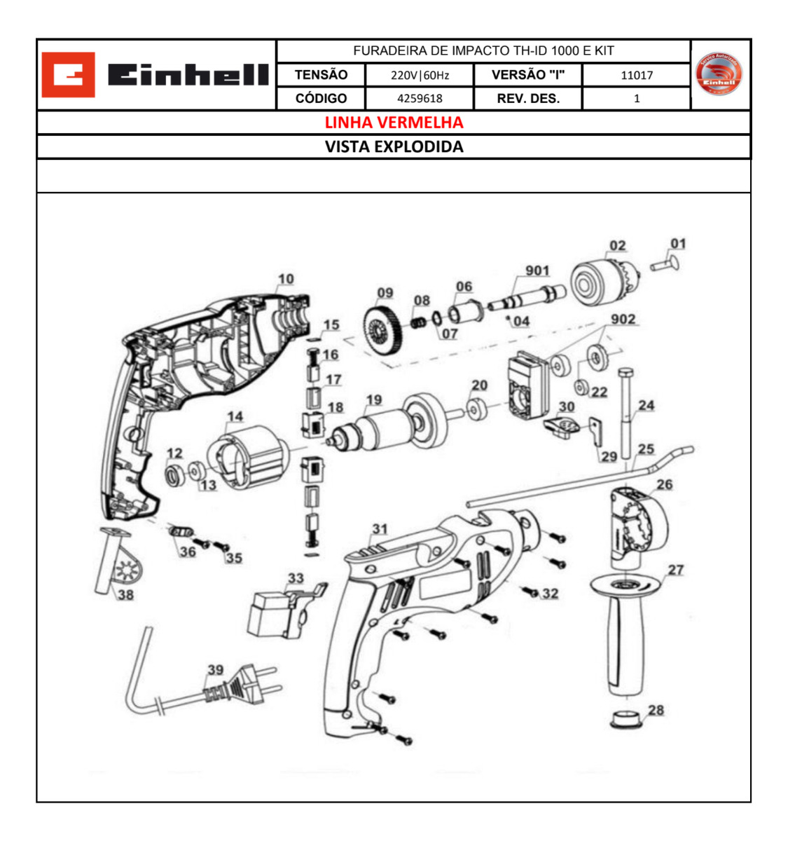 Em até 3x de R$ 22,33 sem juros À vistaR$ 60,28no Pix Kit Mancal + Par de Escovas p/ Furadeira de Impacto TH-ID 1000 E Einhell
